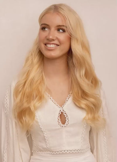 Take your look to the next level with our 20 inch Deluxe Clip-In Hair Extensions in Light Blonde with Strawberry Blonde Highlights. Crafted from the highest grade 100% genuine Remy human hair, these premium extensions provide luxurious length, volume, and a soft, silky finish that blends seamlessly with your natural hair.