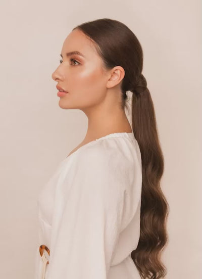 Get the perfect ponytail in seconds with our 22 Inch Clip-In Ponytail Extension in #1C Mocha Brown. Crafted from double drawn, cuticle-aligned 100% Remy human hair, this premium clip-in piece adds instant length, volume, and sleek style to your natural ponytail — without the need for teasing or damage.