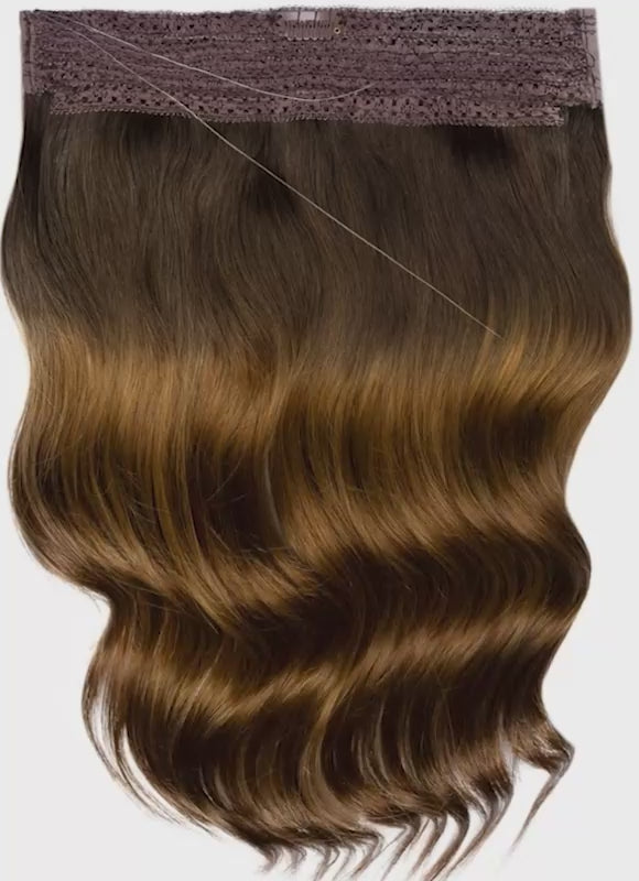 Achieve fuller, thicker hair in seconds with our 22 inch Halo Hair Extensions in Dark to Medium Brown Ombre. Crafted from 100% Remy human hair, this innovative one-piece extension offers a comfortable, lightweight, and temporary alternative to traditional methods like clips, glues, beads, and weaves.