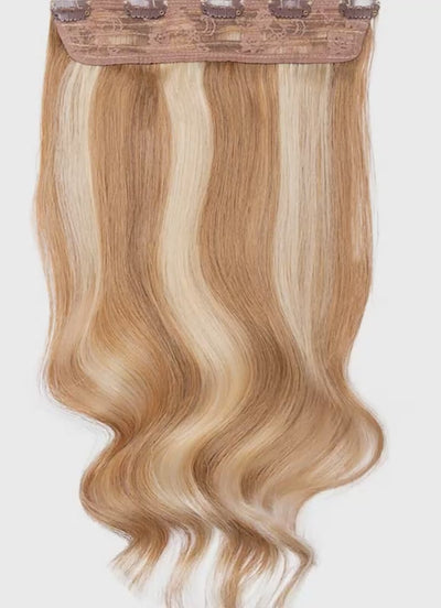 Want fuller, thicker hair in seconds? Our Clip-In One Piece Volumiser Hair Extensions in Light Brown with Light Blonde Highlights #12/613 is the perfect solution for adding instant volume and body — without a full set of clip-in extensions. This striking blend features an even, striped mix of light brown and light blonde strands throughout, creating a bold, dimensional highlighted look. Both colours are evenly distributed for a high-contrast finish that adds brightness and depth to your style.